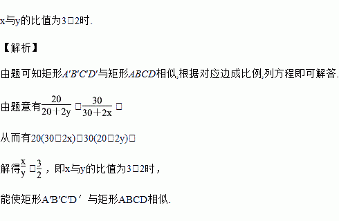如图是学校内的一矩形花坛,四周修筑的小路中相对的两条小路的宽均相等.已知AB=20米,AD=30米,试问当小路的宽x与y的比值为多少时,能使小路四周所围成的矩形A′B′C′D′与矩形ABCD相似?(A′B′与AB是对应边)
