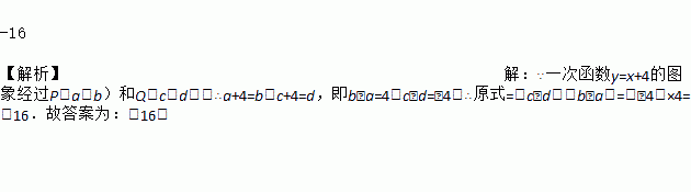 -16 【解析】【解析】 ∵一次函数y=x+4的图象经过P(a,b)和Q(c,d),∴a+4=b,c+4=d,即b﹣a=4,c﹣d=﹣4,∴原式=(c﹣d)(b﹣a)=(﹣4)×4=-16.故答案为:-16.