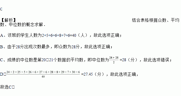 A. 该班一共有40名同学 B. 成绩的众数是28分