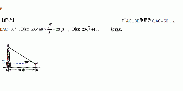 小强和小明去测量一座古塔的高度(如图),他们在离古塔60m的A处,用测角仪器测得塔顶的仰角为30°,已知测角仪器高AD=1.5m,则古塔BE的高为( )