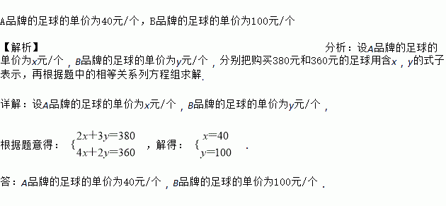 为了响应“足球进校园”的目标,某校计划为学校足球队购买一批足球,已知购买2个A品牌的足球和3个B品牌的足球共需380元;购买4个A品牌的足球和2个B品牌的足球共需360元.求A,B两种品牌的足球的单价.