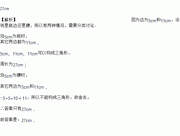 已知等腰三角形的两边长分别为5cm、11cm,则其周长为________________.