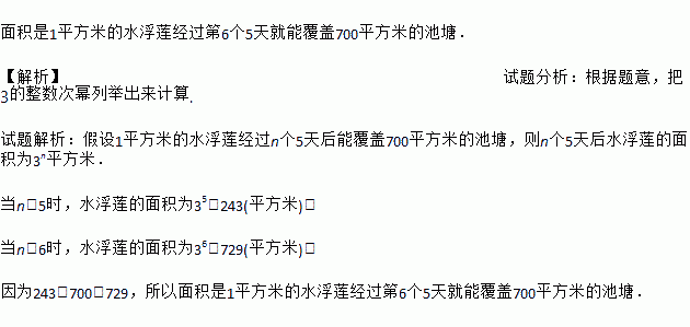 面积是1平方米的水浮莲经过第6个5天就能覆盖700平方米的池塘. 【解析】试题分析:根据题意,把3的整数次幂列举出来计算. 试题解析:假设1平方米的水浮莲经过n个5天后能覆盖700平方米的池塘,则n个5天后水浮莲的面积为3n平方米. 当n=5时,水浮莲的面积为35=243(平方米); 当n=6时,水浮莲的面积为36=729(平方米). 因为243<700<729,所以...