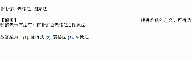 解析式 表格法 图象法 【解析】根据函数的定义,可得函数的表示方法有:解析式、表格法、图象法. 故答案为:(1). 解析式 (2). 表格法 (3). 图象法
