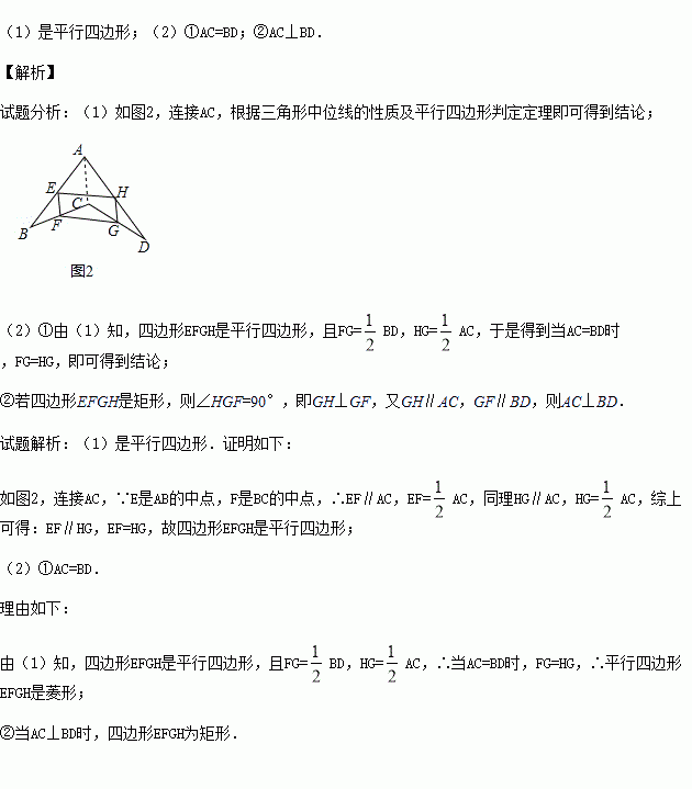 (1)若只改变图1中四边形ABCD的形状(如图2),则四边形EFGH还是平行四边形吗?说明理由,参考小敏思考问题的方法解决一下问题;