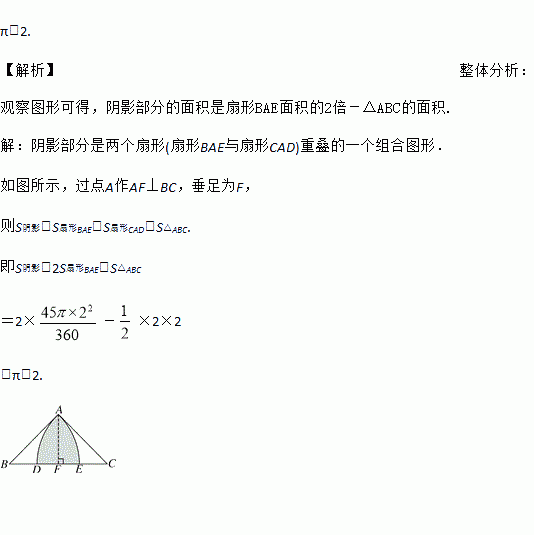 如图,在等腰直角三角形ABC中,∠BAC=90°,AB=AC=2,分别以B,C为圆心,2为半径画弧,求阴影部分的面积.