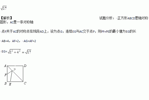 如图,正方形ABCD的边长为4,E为BC上的一点,BE=1,F为AB上的一点,AF=2,P为AC上的一个动点,则PF+PE 的最小值为______________