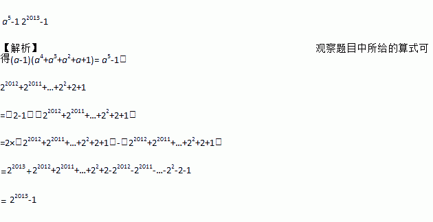 a5-1 22013-1 【解析】观察题目中所给的算式可得(a-1)(a4+a3+a2+a+1)= a5-1; 22012+22011+…+22+2+1 =(2-1)(22012+22011+…+22+2+1) =2×(22012+22011+…+22+2+1)-(22012+22011+…+22+2+1) =22013+22012+22011+…+22+2-2201...