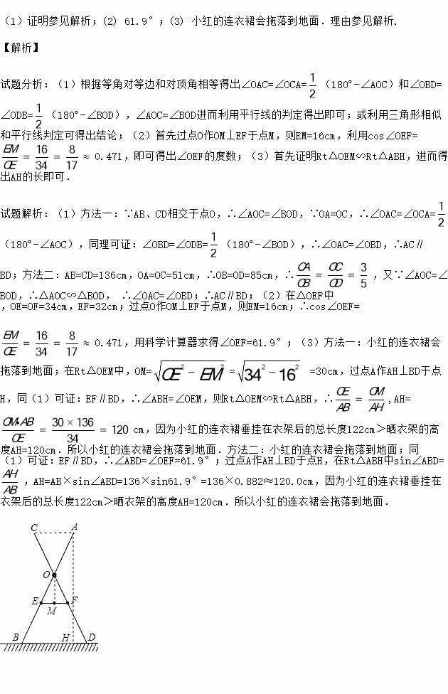 (3)小红的连衣裙穿在衣架后的总长度达到122cm,垂挂在晒衣架上是否会拖落到地面?请通过计算说明理由.