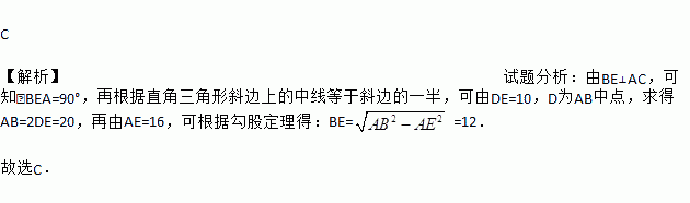 如图,△ABC中,D为AB中点,E在AC上,且BE⊥AC.若DE=10,AE=16,则BE的长度为( )