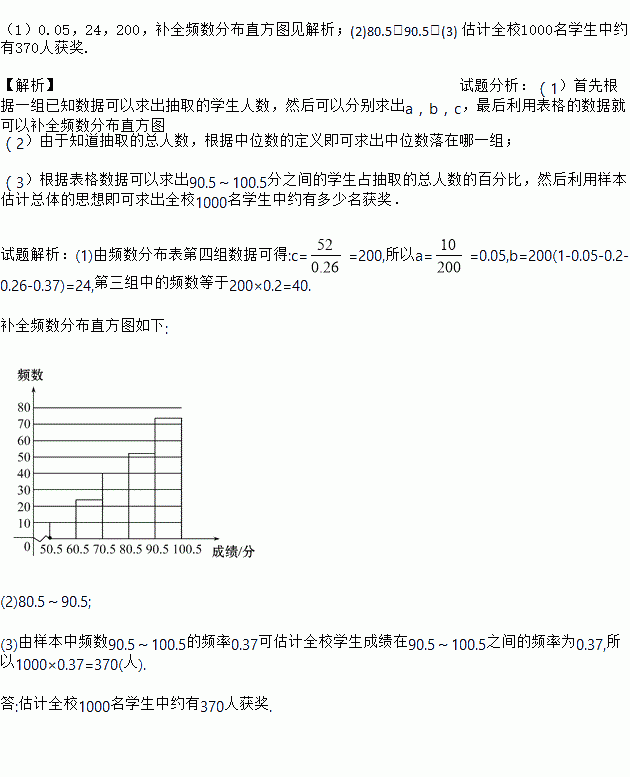 (3)学校将对成绩在90.5~100.5分之间的学生进行奖励,请估计全校1000名学生中约有多少名获奖?