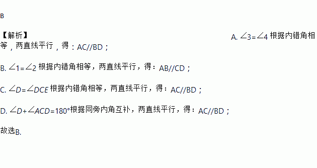 A. ∠3=∠4 B. ∠1=∠2 C. ∠D=∠DCE D. ∠D+∠ACD=180°