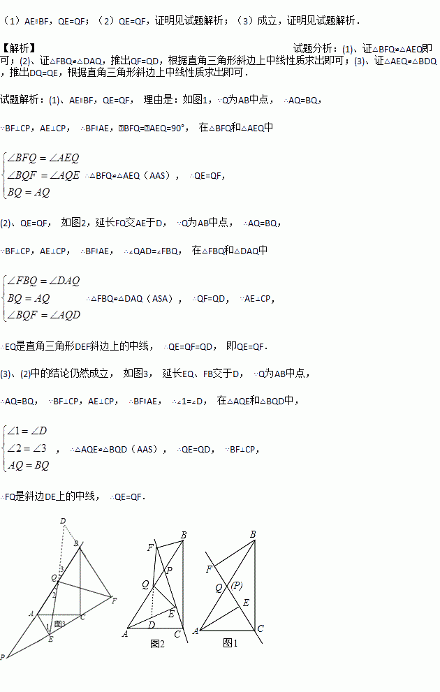 (1)如图1,当点P与点Q重合时,AE与BF的位置关系是 ,QE与QF的数量关系式 ;