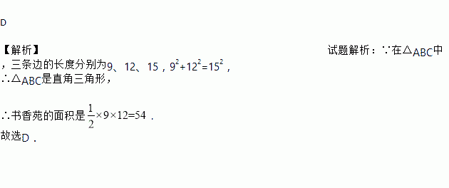 学校的书香苑呈三角形形状,三边分别是9,12,15,那么书香苑的面积是( )