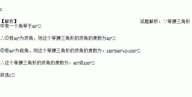 若等腰三角形中有一个角等于40°,则这个等腰三角形顶角的度数为( )