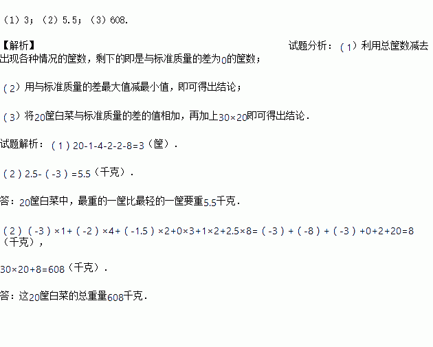 有20筐白菜,以每筐30千克为标准,超过或不足的分别用正、负来表示,记录如表: