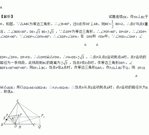 (3分)如图,在等边△ABC中,AB=10,BD=4,BE=2,点P从点E出发沿EA方向运动,连接PD,以PD为边,在PD右侧按如图方式作等边△DPF,当点P从点E运动到点A时,点F运动的路径长是( )