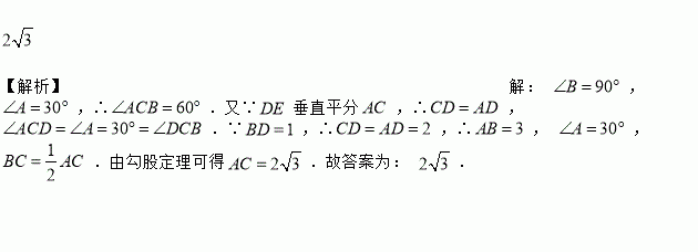 如图,在中, , , 垂直平分斜边,交于, 是垂足,连接,若,则的长是__________.