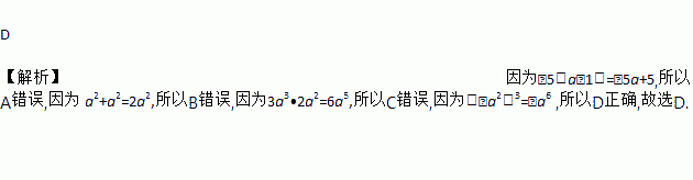 D 【解析】因为﹣5(a﹣1)=﹣5a+5,所以A错误,因为 a2+a2=2a2,所以B错误,因为3a3•2a2=6a5,所以C错误,因为(﹣a2)3=﹣a6 ,所以D正确,故选D.