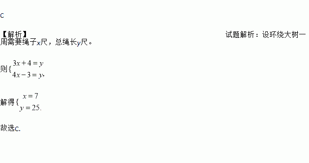 用一根绳子环绕一棵大树,若环绕大树3周,绳子还多4尺,若环绕大树4周,绳子又少了3尺,则环绕大树一周需要绳子( )