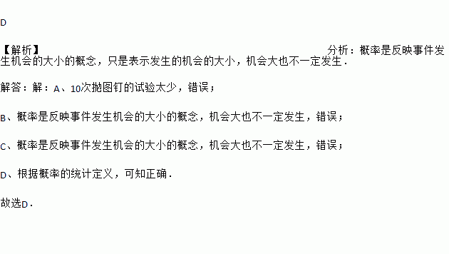 D 【解析】分析:概率是反映事件发生机会的大小的概念,只是表示发生的机会的大小,机会大也不一定发生. 解答:【解析】 A、10次抛图钉的试验太少,错误; B、概率是反映事件发生机会的大小的概念,机会大也不一定发生,错误; C、概率是反映事件发生机会的大小的概念,机会大也不一定发生,错误; D、根据概率的统计定义,可知正确. 故选D.