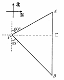 解:过点P作PC⊥AB,垂足为C。∠APC=30°,∠BPC=45°,AP=60……………2分