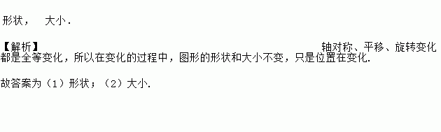 形状, 大小. 【解析】轴对称、平移、旋转变化都是全等变化,所以在变化的过程中,图形的形状和大小不变,只是位置在变化. 故答案为(1)形状;(2)大小.
