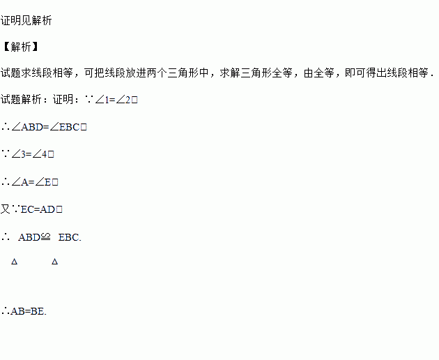 如图,已知∠1=∠2,∠3=∠4,EC=AD,求证:AB=BE.