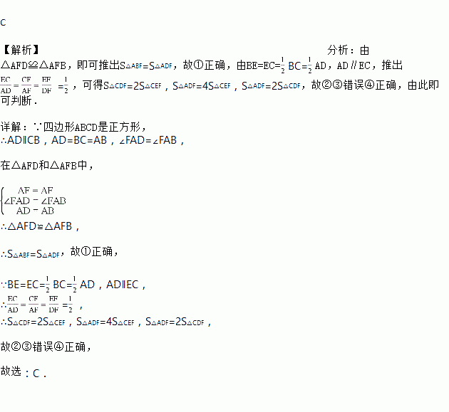 如图,已知正方形ABCD,点E是BC边的中点,DE与AC相交于点F,连接BF,下列结论:①S△ABF=S△ADF②S△CDF=4S△CEF;③S△ADF=2S△CEF;④S△ADF=2S△CDF,其中正确的是( )