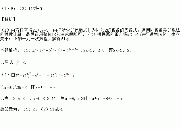 (1)若2x+5y-3=0,求4x•32y的值.(2)若26=a2=4b,求a+b值.