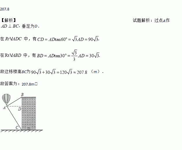 如图,从热气球上看一栋高楼顶部的仰角为30°,看这栋高楼底部的俯角为60°,热气球与高楼的水平距离为90m,则这栋楼高为_____(精确到0.1 m).