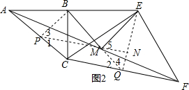 如图2,取AC,CF的中点P,Q,连接BP,EQ,MQ,PM,