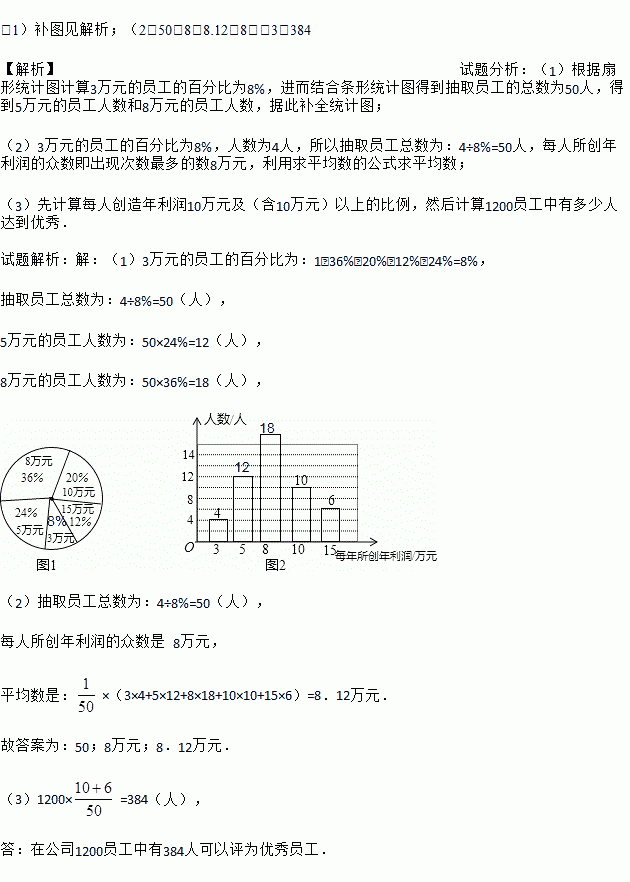某公司为了了解员工每人所创年利润情况,公司从各部抽取部分员工对每年所创利润进行统计,并绘制如图1,图2统计图.