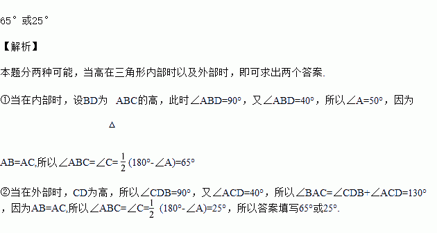 若等腰三角形一腰上的高与另一腰的夹角为40°,则它的底角为___________.