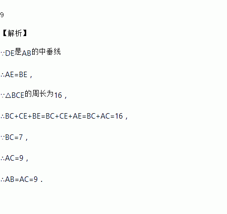 如图,在△ABC中,AB=AC,DE是AB的中垂线,△BCE的周长为16,BC=7,则AB的长为________.