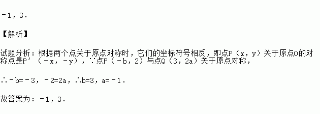﹣1,3. 【解析】 试题分析:根据两个点关于原点对称时,它们的坐标符号相反,即点P(x,y)关于原点O的对称点是P′(﹣x,﹣y),∵点P(﹣b,2)与点Q(3,2a)关于原点对称, ∴﹣b=﹣3,﹣2=2a,∴b=3,a=﹣1. 故答案为:﹣1,3.