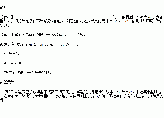 将正整数按如图方式进行有规律的排列,第2行最后一个数是4,第3行最后一个数是7,第4行最后一个数是10,…,依此类推,第________行最后一个数是2 017.