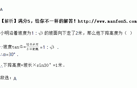 小明沿着坡度为1:的坡面向下走了2米,那么他下降高度为( )