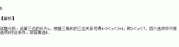 若某三角形的两边长分别为3和4,则下列长度的线段能作为其第三边的是( )