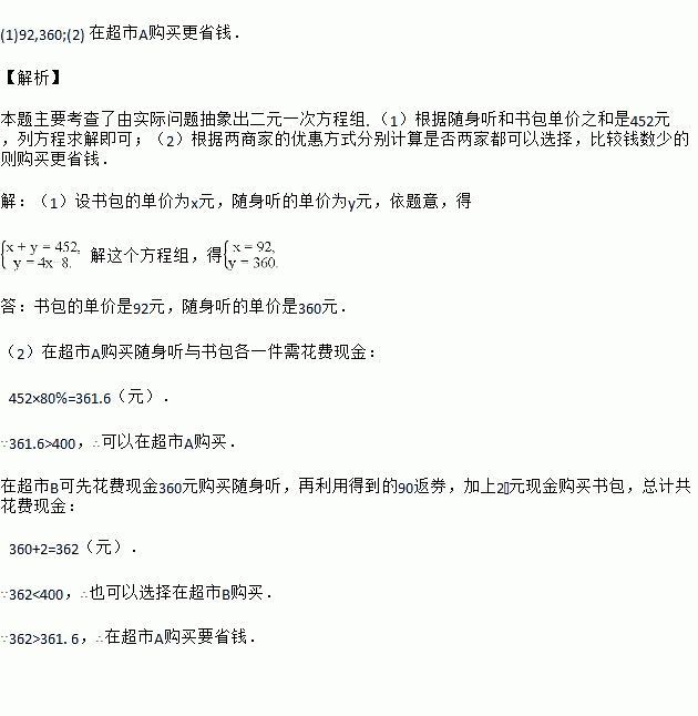 (2)某假期该同学上街,恰好赶上商家促销,超市A所有商品打八折销售,超市B全场购满100元返购物券30元(销售不足100元不返券,购物券全场通用),但他只带了400元钱,如果他只在一家超市购买看中的这两样物品,你能说出他可以选择在哪一家购买吗?若两家都可以选择,在哪一家购买更省钱?