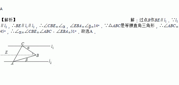 如图,直线l1∥l2,等腰Rt△ABC的直角顶点C在l1上,顶点A在l2上,若∠β=14°,则∠α=: