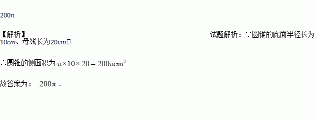 一个圆锥的底面半径为10cm,母线长为20cm,则该圆锥的侧面积是________cm2.