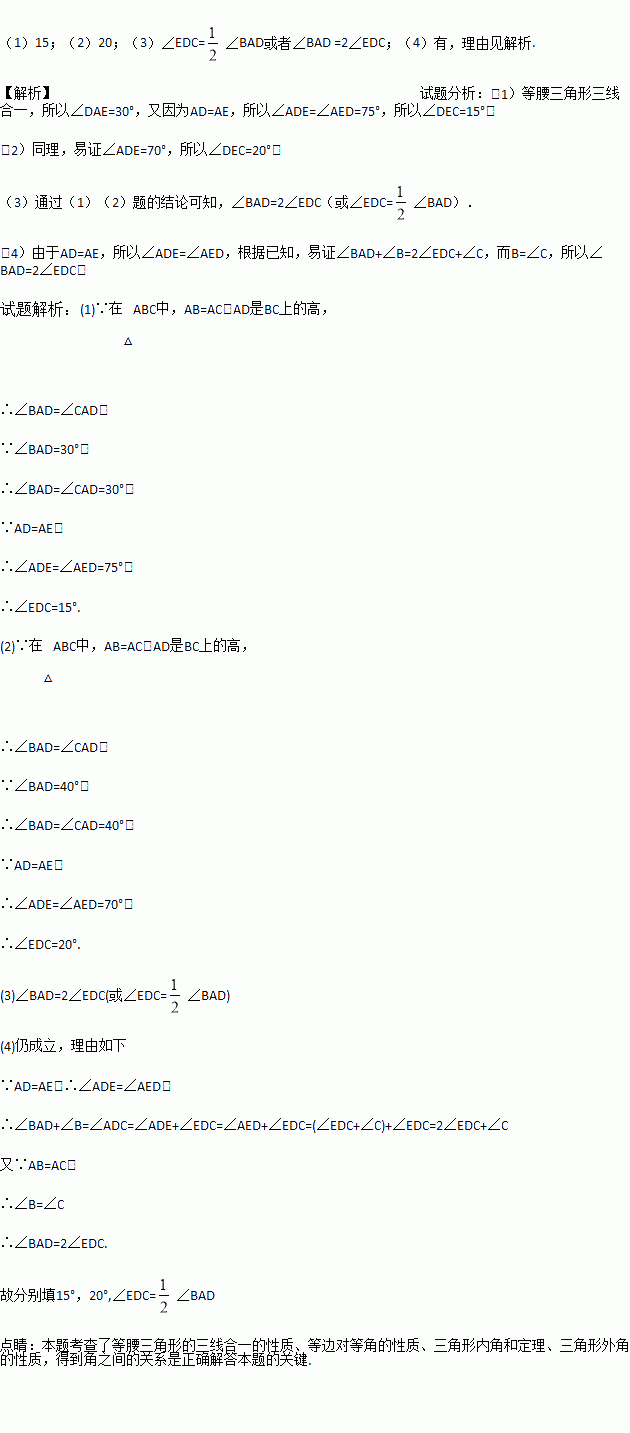(1)如图1,如果∠BAD=30°,AD是BC上的高,AD=AE,则∠EDC=_____度;