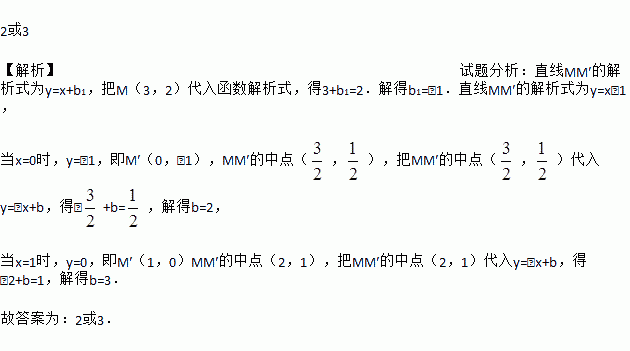 如图,已知点M的坐标为(3,2),点M关于直线l:y=﹣x+b的对称点落在坐标轴上,则b的值为 ________
