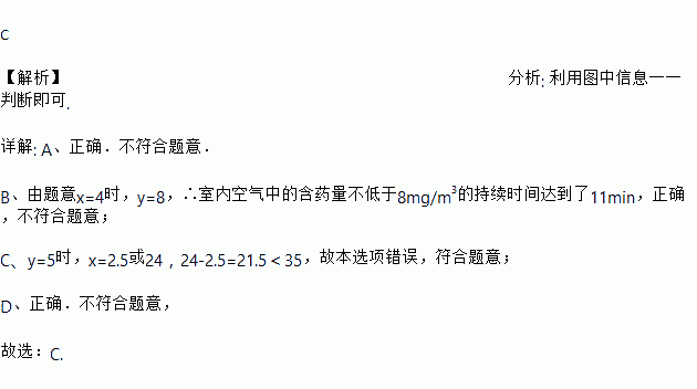 与药物在空气中的持续时间之间的函数关系,在打开门窗通风前分别满足两个一次函数,在通风后又成反比例,如图所示.下面四个选项中错误的是( )![]()