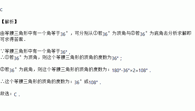 若等腰三角形中有一个角等于36°,则这个等腰三角形的顶角的度数为( )