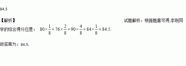 李刚同学的四次数学测试成绩分别是80分、76分、90分、84分,如果按照1:2:4:1的权重对这四次成绩进行综合评价,李刚同学的综合得分是_____分.