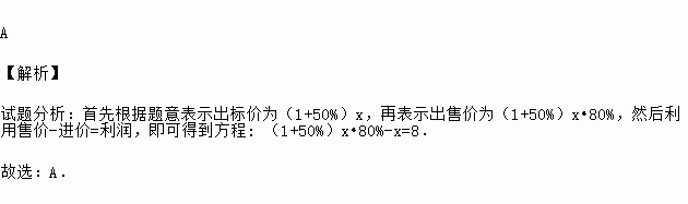 某商场把一个双肩背书包按进价提高50%标价,然后再按八折出售,这样商场每卖出一个书包就可赢利8元.设每个双肩背书包的进价是x元,根据题意列一元一次方程,正确的是( ).