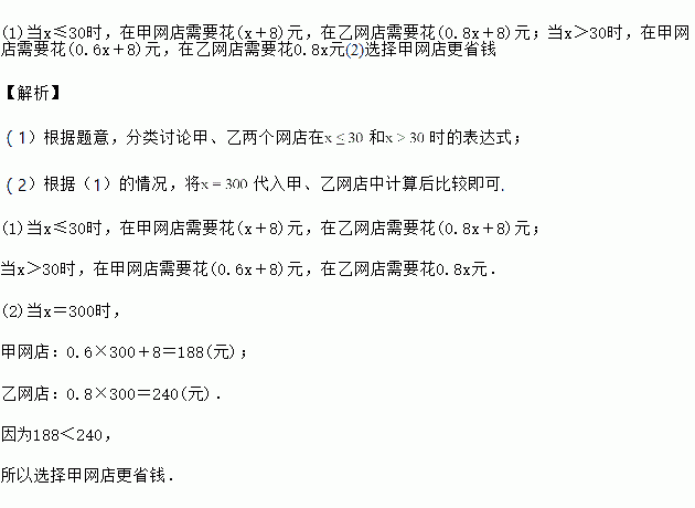 (1)假若精品书店想购买x张贺年卡,那么在甲、乙两家网店分别需要花多少钱(用含有x的式子表示)?(提示:如需付运费时运费只需付一次,即8元)