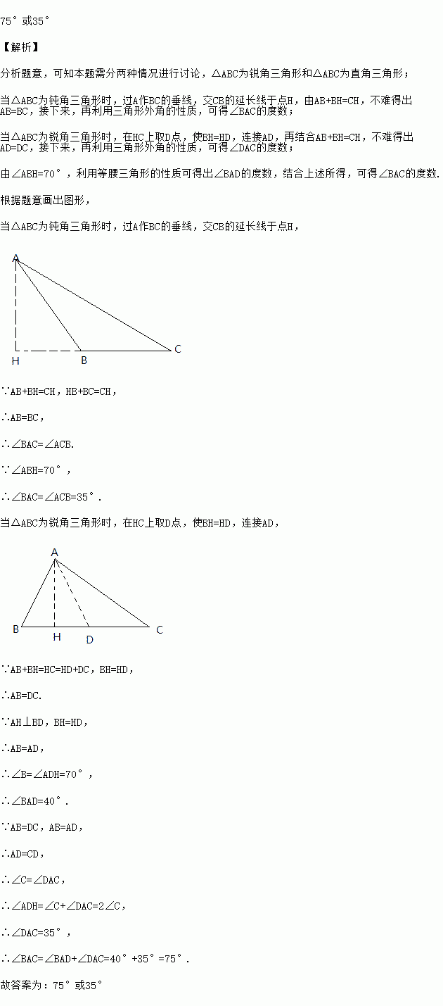 已知:在△ABC中,AH⊥BC,垂足为点H,若AB+BH=CH,∠ABH=70°,则∠BAC=_____°.